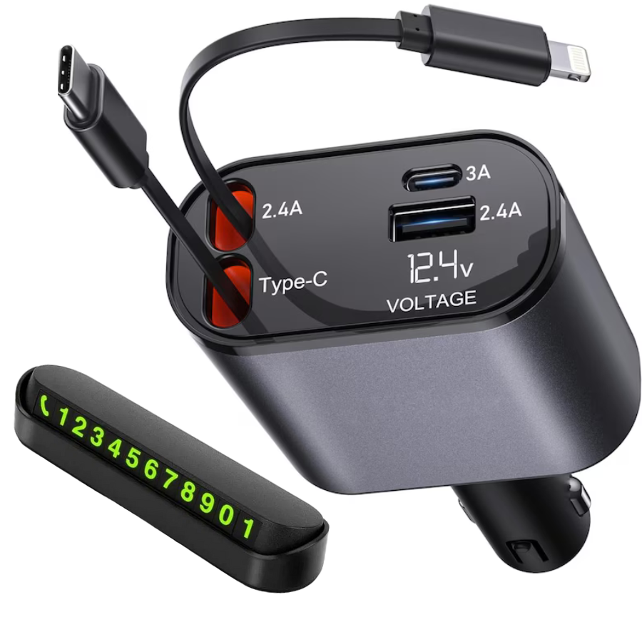 Poți să încarci până la 4 telefoane simultan, având 2 cabluri retractabile(USB-C și Lightning pentru iPhone) și 2 porturi USB-C și USB-A.
