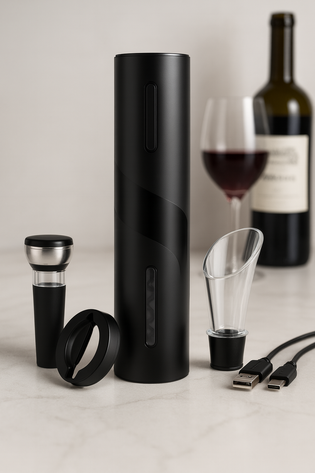 În cutie primești tirbușonul cu cablu de încărcare, un tăietor de folie pentru sticlă, cât și un aerator cadou 🎁